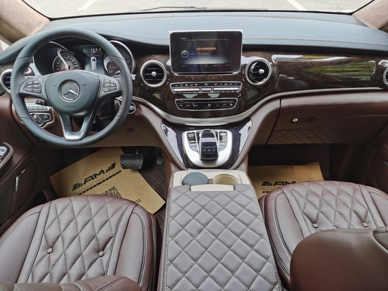这款奔驰V260的贵宾舱采用的是两两对坐的商务洽谈格局设计,在大尺寸的液晶电视下方,奔驰V260配置了两个可折叠的秘书座椅,可一键电动展开。在两张秘书座椅的中间,是一个小型车内吧台,内置胶囊式咖啡机和一个折叠小桌台,最大限度的利用车内空间,折叠小桌台也可以给车内的商务人士提供一个处理文件以及与客户洽谈的台。