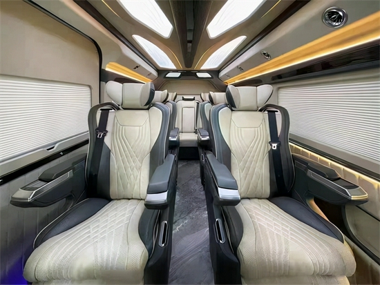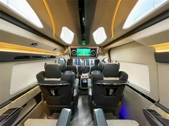 乘客舱配备了可360旋转的首长级航空座椅,拥有通风,加热,腰托等等功能,旋转过去之后再配备高档的办公桌版,提供了一个很好的娱乐空间或会议空间。充分体现了其人性化的设计以及对于乘车人员舒适度的考虑。