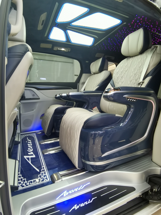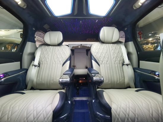 四门包覆 不锈钢迎宾踏板 吸顶DVD系统 艾维亚创意顶灯 车内氛围灯 星空顶 连体式前排中央扶手 一体式电动车载冰箱。三排升级nappa皮 二排航空座椅(带电动腿托、按摩、通风、加热) 罗马印花地板 前排折叠桌板带无线充电设备 折叠脚踏板。