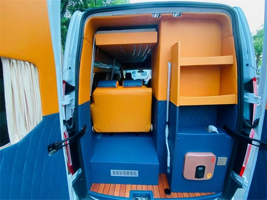 顶部设有顶灯以及我们的氛围灯光提升我们整体的氛围感,在尾部我们也是设有沙发座椅的,在我们行车过程中可以拼成床进行休息,并且上方也配有吊床,兼具我们空间性的同时也保障我们的休息区域。