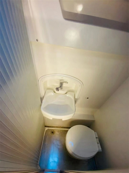 尾部我们配有卫生间以及我们的沙发座椅跟吊床;卫生间我们配有坐便器,可折叠洗手台方便我们日常使用,90L的净水箱也让我们有良好的沐浴条件。沙发座椅在不需要时可以形成沙发床保障我们的休息空间,同时顶部的吊床也可以为我们提供休息空间,能满足我们的休息空间。