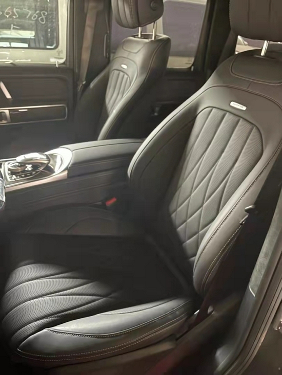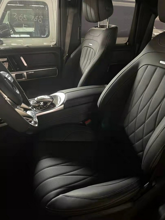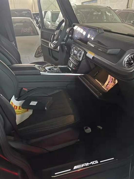 奔驰G63内饰方面,奔驰的设计绝对可以用惊艳来形容,无论是经典车型还是超豪华车型甚至是入门级的豪华车上,奔驰的内饰都会让你眼前一亮,当然了这也是奔驰的一个特色。所以这部全新的G63在内饰的表现上也是情理之中的,但是细节上还是有些小小的意外。这种感觉是打开车门的瞬间就能够感受到的。首先仪表和中控屏依旧是采用了同一款液晶屏显示,第一感觉就是科技感爆表。而其他方面例如方向盘,空调出风口,挡杆等等的设计充满设计感。
