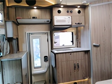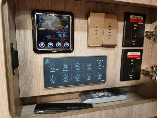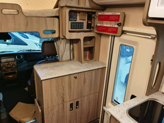 厨房区域配有微波炉,移动电磁炉方便我们日常使用,同时在上门柜台处我们配有整车的能源系统以及我们的电路集成控制面板;1000AH的锂电池以及1200W电站级别的太阳能板笔即便不去房车营地也能七日无忧用电。同时四套能源回收系统能为我们提供地暖以及热水而不用另外用电,工艺方便十分成熟。