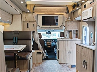 内部采用深色环保板材装饰看上去更为舒心;额头区配有电视以及额头床方便我们娱乐的同时又提供休息区域;没有配备天窗是为了更好地保温隔热;会客户采用对坐式卡座同时配有外置桌板也可满足我们六人同时的吃饭;会客区上方配有4个吊柜,同时我们的卡座下方也可以进行储物,再搭配我们尾部的储物仓让我们拥有近2500L的储物空间。