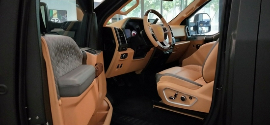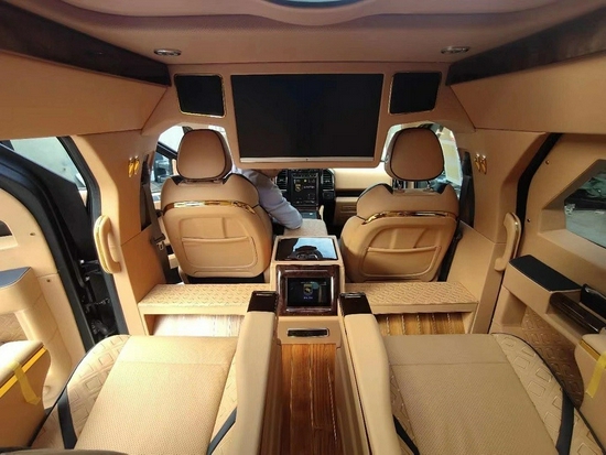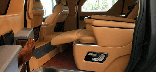 部颜色风格 内饰色调 棕色 车体内部结构 前后舱时尚设计 超大电动隔屏,40寸超薄显示器 整车座椅数 6座 驾驶区主要配置 驾驶室车顶 高级鹿皮 地毯 原厂豪华地毯 乘客区主要配置 座椅 带加热、按摩及腿部支撑电动多向座椅 车顶探照灯 高级鹿皮及乔治巴顿标志 地板 全舱柚木地板 吧台 3D式设计、白色光带及氛围灯 座椅中央扶手 马鞍式设计带击沉触摸控制系统 空调系统 前后舱独立控制,度调节。