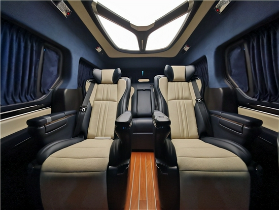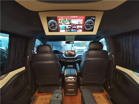 乘客舱的设计风格和驾驶舱一致,大量棕色的超纤真皮包覆,车顶前方采用的是半隔断的互联网电视,加上全车8声道的音箱,带来了很好的视听感受。地板采用的是游艇级的柚木实木地板的设计,既美观又大气。二排阿尔法同款航空座椅,通风、加热、电动腿托一应俱全,同时可进行旋转。上有星顿天幕顶灯,如同身处于高级会议室中,为您的业务洽谈带来极度的舒适感。
