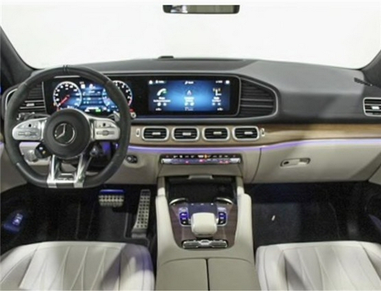 21款奔驰GLS63 (配置|询价)内饰设计非常豪华,AMG家族专属的镀铬金属方向盘质感不俗,双联屏的设计凸显了科技感,下部的四孔式出风口代表了GLS旗舰的地位,大量的真皮和实木进行装饰,营造出浓郁的豪华感。