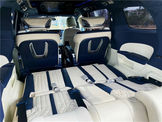 两个商务航空座椅,替换了传祺GM8原车中排座椅,功能同中高配类似,拥有电动前后移动、旋转、通风、按摩、加热、放倒躺下休息,配置了一体腿托、扶耳式头枕,中排过道足够进入三排,车内铺设了地板,