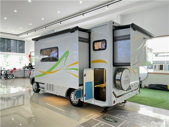 整车外部配外置抽拉厨灶,注水口、外置桌板、尾部贯穿式储物舱、电动驻车支腿等设备;方便我们在户外烹饪的同时,也为我们提供良好的储物空间以及驻车时的稳定性。