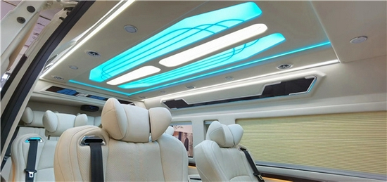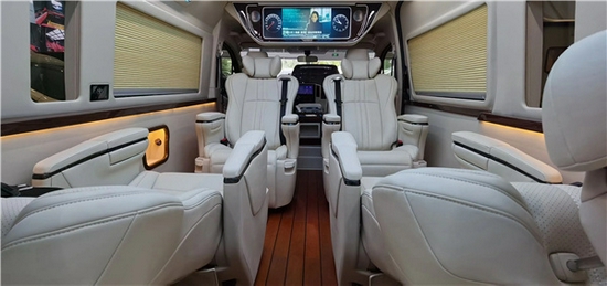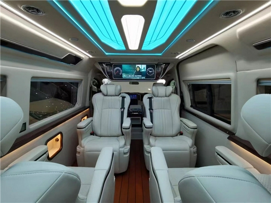 车采用了四张埃尔法同款的航空座椅,座椅构造更符合人体曲线,坐上去有种陷进去的感觉,令旅途行车倍感舒适,后排还有电动沙发座椅,可以放倒成床,稍作休息十分不错。海狮改装商务车不仅提供给我们舒适的乘车环境,再加上车内增加了隔音设备,对回声的处理,更是为我们提供了最舒适的环境,宽敞的空间,奢华的内饰。