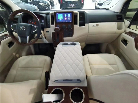 丰田海狮HIACE车厢设计宽敞,中间走道将乘客座椅隔开,更方便乘坐及进出。所有座椅均为高级真皮并配备头枕,每个头枕及椅背均可调节至适宜高。