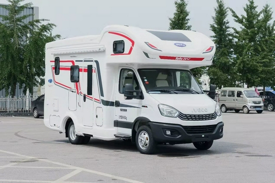 Y9-依维柯配备了1200W电磁炉、美的微波炉、32寸专用车载智能电视、抽拉柴油灶、美的3公斤壁挂洗衣机、148L 双开门弗罗斯特车载冰箱、宏都驻车冷暖空调(热泵式)、独立柴油暖风系统等。