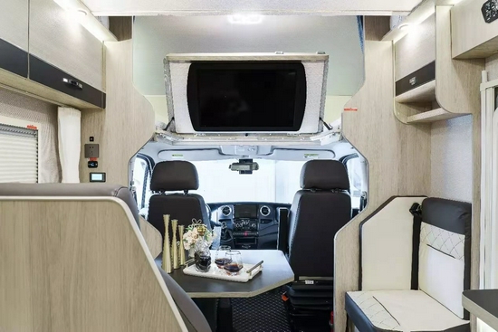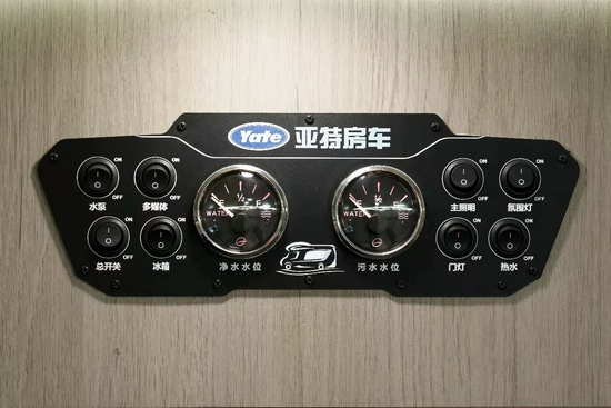 Y9-大通配备了1200W电磁炉、美的微波炉、19寸专用车载智能电视、抽拉柴油灶、美的3公斤壁挂洗衣机、148L 双开门弗罗斯特车载冰箱、宏都驻车冷暖空调(热泵式)、独立柴油暖风系统等。并且集成控制面板设置在我们上门处,配上标示方便我们使用。