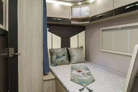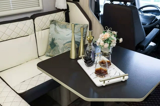 家具颜色选择了深浅撞色,搭配氛围灯营造出一种温馨奢华的氛围。布局方面,从前至后依次为驾驶室、会客区、厨房区、卫生间和休息区。四周都有储物柜,零碎的小物件收纳在里面,也不怕随意放置弄丢了。