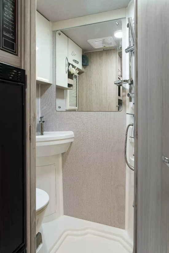 整体式卫生间,各项配置很齐全,淋浴花洒、热水器、洗手池、储物柜以及抽拉盒式马桶、集成式卫浴系统一应俱全,黑水箱18L。完全能够满足我们的日常需求。