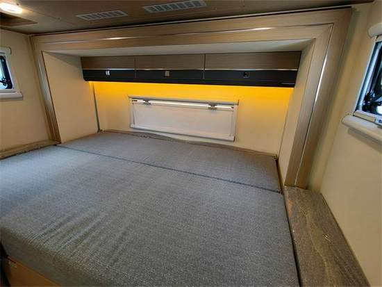 座椅下方配有220V/USB插座接口,便于日常手机、电脑等充电;暖色的气氛灯,使客厅区域显得非常温馨。座椅后面镶嵌进口152L大容量冰箱,如果床位不够睡可以把这个区域也拼成一张床。