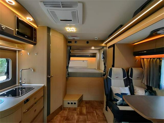 车内的会客区,米色和白色的浅色搭配,十分温馨,采用了双人对坐沙发的设计,人体工程学沙发座椅,可以根据自身情况调节,中间配置有高档的升降餐桌,与卡座可以拼成一张能供提供休息的临时床铺。