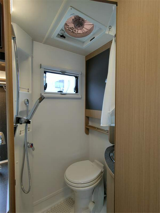 卫浴间位于车体的中后部一侧,采用整体式复合防漏水设计,配置有多功能豪华卫浴系统,内置进口水封电动粉碎式座便器、置物架、淋浴花洒、水池、换气扇、美式黑水箱等。