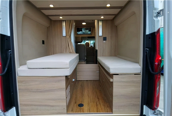 下铺尺寸为1.85*1.245m,配备抽拉式铝合金后床骨架,可轻松睡下两人。如果将下方床垫翻折,可腾出1m多的储物空间;上部升降床为1.7*0.9m,加备两侧防护网。更值得一提的是,宾歌B900拥有超越同级别车型的储物空间,全车的生活区域为更好地利用每一块空间,配备了储物吊柜、储物衣柜、可调节前后距离座椅、卫生间推拉门等设计,为居车生活提供更多可活动空间。