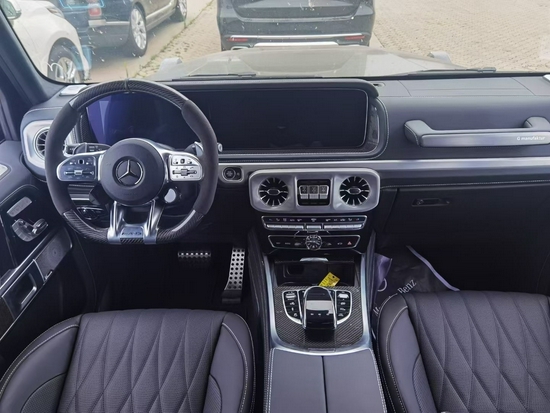 21款奔驰G63豪华精致的真皮包覆提供了足够的舒适性和支撑性,通风和加热功能让乘客免受高温和寒冷的煎熬。中控台多处均采用碳纤维材料覆盖,带彩色TFT显示屏的AMG仪表盘、AMG主菜单和单独的挡位显示器以及采用白色照明的AMG门槛。