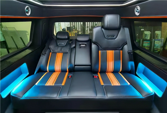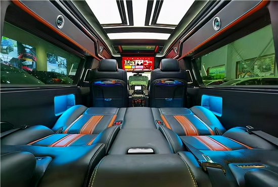 正副驾驶座椅后方独立的办公小桌板,碳纤维装饰条,在下方还有独立的后排控制按钮,可调节后排空调出风口,全车顶部光纤灯三色可调节,下方的空气净化器保障了车内完好的空气环境,全车采用高密度超纤材料地板,踏感更好;二排的座椅采用上等牛皮包覆的航空头等舱座椅,八项电动调节,前后,靠背,腿托,头枕,一键调节更加便捷舒适,座椅通风加热按摩也是必不可少;