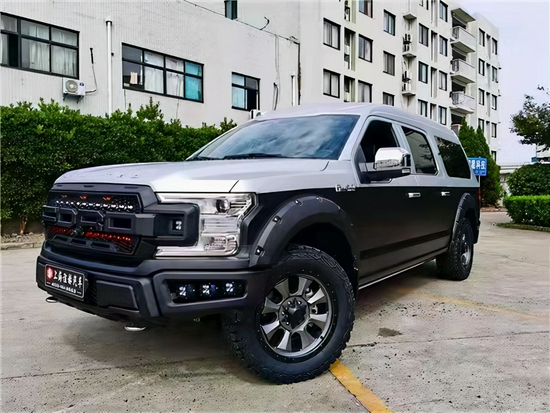 今天给大家带来的这款福特F150勇猛者;底盘公告也升级为了商务车公告,不再有皮卡的强制报废的限制,并且可以进入市区;外观方面采用了银色与黑色的双拼设计质感十足,前脸采用霸气的哑光中网,搭配两侧的疝气大灯,线条直硬朗,硬实大气。彰显了其霸气狂野的气质。整车尺寸: 5.907米、宽度2.08米,高度2.16米;3.5TT双涡轮增压10速手自一体变速箱,最大可爆发381马力为我们提供超强的动力,同时内部空间也是十分宽阔的。电话:18017691185微信同号。