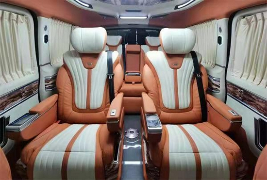 后舱采用两张尖端智能航空座椅,通风加热按摩腿托等功能一应俱全,智能语音控制系统与触摸式控制系统相交结合,最重要的还是配备了重力感应系统,当你坐上去时会给你自动调节。车身内部乘客舱天窗,电动智能化,车身两侧高档对开丝绒窗帘 ,注重隐私安全性。前座背部可折叠桌板,完全可以进行会议办公,可展开电子平板摆放等娱乐休闲模式。全车豪华游艇级内部装备,带给用户体验的就是,游艇级的轻奢享受。