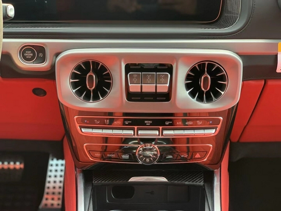 21款奔驰G63中控台较为引人注意的就是空调口的设计,设计师称设计灵感来源于发动机的涡扇,带来了动感的造型以及富含力量感的气势。全新造型的底式AMG运动方向盘战斗力十足,其两侧还配以打孔皮质包裹手感绝佳。