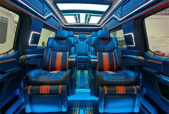 中排座椅采用了两张带独立腿托的航空头等舱电动按摩座椅,还可以上下电动调节,超大的尺寸带来了无与伦比的车内空间,不仅可以用以商务接待家庭出行也非常好用。喜欢越野到处去玩也没有问题。