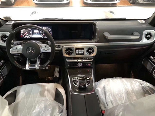 全新G63内饰方面,新G63保留了新G500的整体设计,除配色差异外,新车 还换装了全新造型的平底式AMG运动方向盘,其两侧配以打孔皮质包裹,下部镀铬装饰的造型也与新G 500明显不同,看上去十分战斗。此外,全液晶仪表盘+中控大屏的双12.3英寸屏幕设计在新车上也没有缺席,营造出了浓郁的科技感。