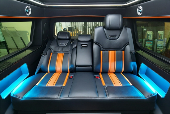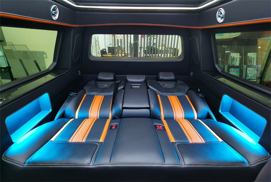正副驾驶座椅后方独立的办公小桌板,碳纤维装饰条,在下方还有独立的后排控制按钮,可调节后排空调出风口,全车顶部光纤灯三色可调节,下方的空气净化器保障了车内完好的空气环境,全车采用高密度超纤材料地板,踏感更好,档次更高;二排的座椅采用上等牛皮包覆的航空头等舱座椅,十向电动调节,前后,靠背,腿托,头枕,一键调节更加便捷舒适,座椅通风加热按摩也是必不可少的。