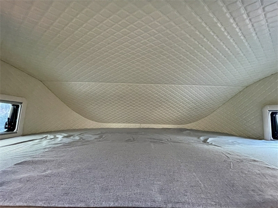 在前方驾驶室上方的额头区域内还提供了一张尺寸为2200mm*1400mm的双人床,一前一后两张大床,足够睡下一家四口。在可折叠的床板下方还带有一台32寸的小米网络电视,可以为平时的生活添加娱乐色彩。
