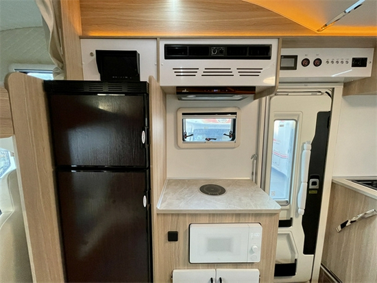 厨房区域,网红6号将房车爱好者熟知的房车专用配置全部标配,如148L房车专用冰箱、7kg滚筒式洗衣机、微波炉、抽油烟机、电磁炉、方形水槽、空调出风口、4路监控系统等。