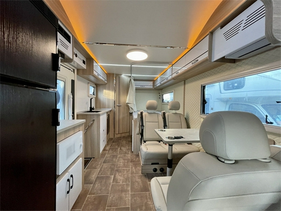 这款房车采用常见的四人对卡座形式,乘用车级别的座椅可以带来更加舒适的乘坐感受,同时配备了四条安全带,所以整车在行驶过程中最多可以乘坐六人。配备的大尺寸餐桌非常的实用,几个人坐在这里享受丰富的大餐也完全够用。
