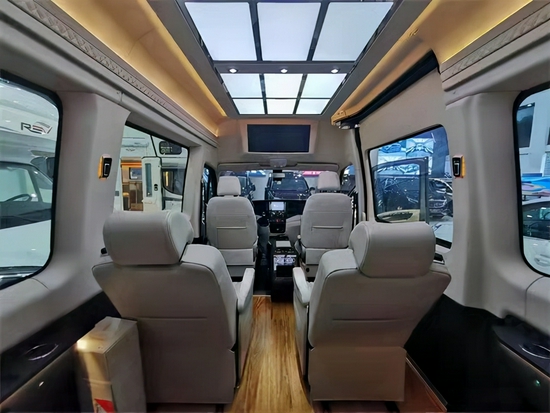 地板采用柚木地板,简约大气后期保养与打理也方便;在前后舱之间配置了一个车载液晶电视娱乐系统加上环绕声音响,虽然没有斯宾特那种超大尺寸的液晶电视,但是用于娱乐以及 影视播放是丝毫不逊色的。