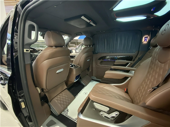 2021新款奔驰威霆改装平顶七座豪华商务车全新升级。奔驰威霆平顶7座商务车后舱第三排座椅采用的是三联座沙发,可通过旁边按键一键快速变成舒适大床,后排采用隐私玻璃使后排的私密性更好,全车顶部麂皮绒包覆与星空顶的搭配,在这样的私密空间中可进行商务洽谈,也带给您一个豪华、私密、舒适的MPV体验感。