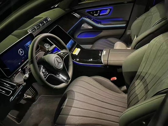 全新奔驰S500内饰,中控台垂瀑式中央触控屏从中控台纵向延伸,凸显出了简约的设计感。整个内饰的豪华感当然是无须质疑,触手可及之处几乎全用上了皮革包裹,配合带263个LED单元的动态氛围灯进一步升华了内饰氛围感。AMG Line的方向盘通过对造型的重新雕塑,变得更加立体。作为轿车领域舒适标杆,S级的座椅功能性毋庸置疑,前排除了常规的电动调节,座椅记忆、座椅加热、通风以外,甚至连方向盘、车门扶手、中央扶手箱、座椅头枕都带有加热功能。另外前排座椅还带有10种模式的热石按摩;侧翼还带有支撑气囊,能在过弯时提供侧向支撑。