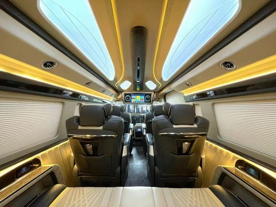 进入到商务舱,铝合金的踏步,全车进口柚木地板搭配进口的地毯。整车采用2+2+2+3的布局,商务舱配备四个独立的航空座椅,具备通风加热按摩腿托的功能,并且座椅可以往后进行旋转,与后面的人进行一个面对面的对坐,形成一个卡座的状态,方便吃饭,开会,娱乐,打牌,功能性齐全。第四排电控沙发床可放平至180度,并且带有加热的功能,简简单单组成一张床,可供日常的进行休息。