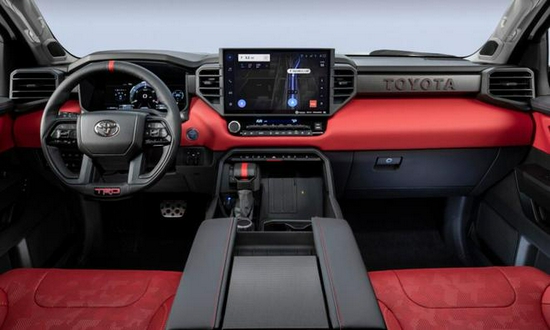 以往丰田皮卡车系列内饰设计确实没什么看点,就像丰田普拉多 (配置|询价)一样,主要以实用为主。但是现在时代变了,年轻消费群体越来越追求科技配置,丰田设计师团队也不得不做出一些改变,这次全新丰田坦途皮卡车内饰科技氛围已经相当强烈了,不仅有全液晶仪表盘加持,而且提供了超大面积悬浮导航屏幕,视觉效果甚至能够媲美特斯拉,TRD高性能版本更是提供了丰富的内饰装饰,比如红色真皮面料座椅,搭配有专属刺绣装饰。