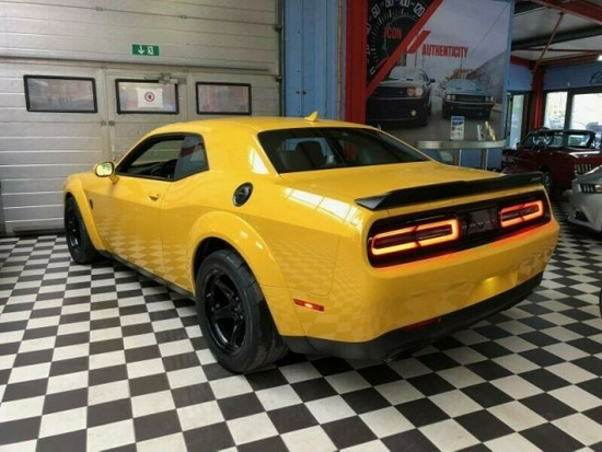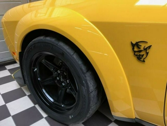 道奇挑战者SRT Hellcat至少在外观美学方面,在改装领域里已经很有特色。很明显车辆采用了宽体套件,宽大的轮眉以及金色的轮毂格外醒目。