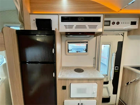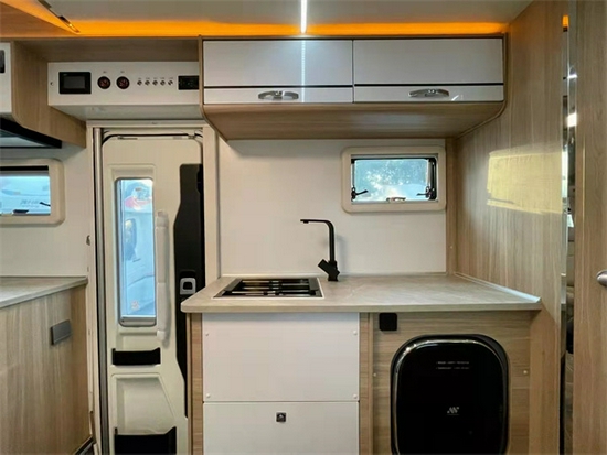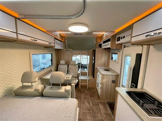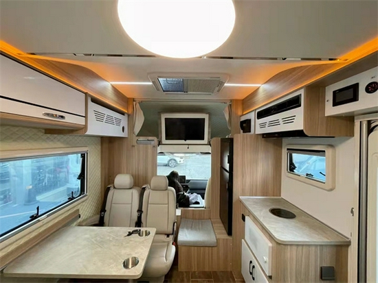 通观整个车辆的布局,走的是清新便捷的路线。一眼看上去少了很多复杂的装饰和装修,更多的是,将整个车辆的功能区域划分明确。一方面最大可能性的节省车内的空间,另一方面,能使使用者在车内可以做到有条不紊的生活。整车分为,驾驶舱区域,会客厅区,厨房区,休息区以及卫浴区。每一块的划分均很明确,界限分明。