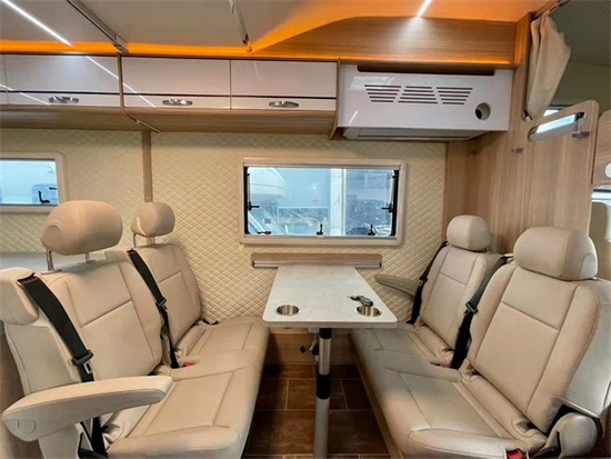 再看一下我们的会客区,一张可升降的小桌板,和四张座椅组成了我们的沙发卡座。同时沙发卡座在需要的时候也可以拼接成床,临时休息或者人多的时候用的上。单独作为会客区来讲,整车荷载人数是6人,卡座部位均可加装儿童座椅,并且做了真皮包覆,整个柔软度和档次感也能凸显出来。