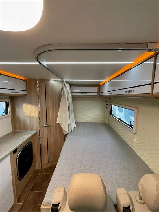 首先我们来看休息区,全车共有两个床铺,一个是额头床2.15*1.5米,一个是后置纵床2.2*1.4米,均可满足两个成人的日常休息。对于房车的日常行驶来看,有一个稳定的纵置床,是非常具有安全性和稳定性的,特别是在低速行驶的过程中,乘坐者偶尔困了累了,躺在床上休息也是不影响的。同时也有横置床的布局。