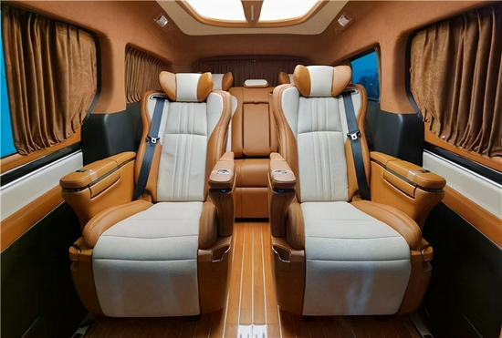 车内顶部为采用的是麂皮绒的软包加上星盾天幕顶灯,周边还配备了高级隐私窗帘,全车进行了多层隔音,降噪,保暖等处理。第三排采用的是三连排电动沙发床,可以180度的平躺,可以日常休息睡觉。作为一款商务车,其功能性,舒适性以及档次性都是很不错的。