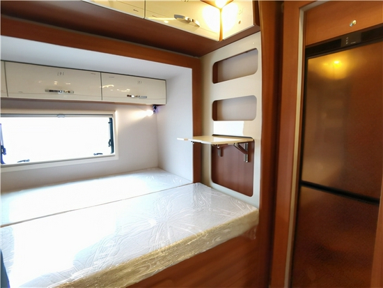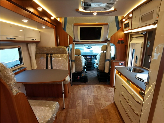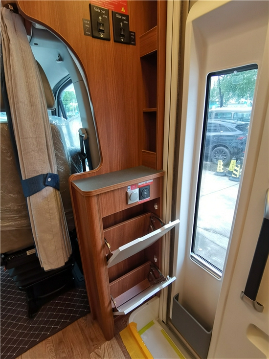 进入车内被这款房车金碧辉煌内饰的气势所震撼,在灯光的映射下,白色烤漆柜门以及晶莹剔透的玻璃门都在闪闪发亮,无处不彰显奢华。车内家具选用环保板材,地面铺设的是环保阻燃地板革。拓展舱打开后,内部空间极其宽敞,可以供一家人舒适生活,内顶安装了德国进口REMIS天窗。在车厢内部,第一眼可以看到的就是拓展式的卡座。对坐式沙发卡座采用2+2的布置形式,中间安装了一块可以升降的桌板,桌板降下来以后摇身一变成为一张长度1.9米,宽度0.9米的单人沙发床。