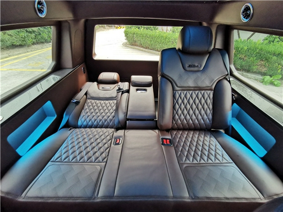 顶部半隔断的车载无线网络电视机,全车10个进口BO音响系统,再配合顶部天窗和后部的三色宫格顶灯相结合,搭配整车的线条式氛围灯,凸显整车的层次感,也烘托了整体的氛围。