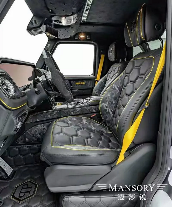 G63 Star trooper再次展现了MANSORY在豪车定制领域超迈绝伦的霸者实力:全车镀以浓郁的丛林野战风灰色迷彩膜,车身通体包覆由材料界的“黑色黄金”——航空级锻造碳打磨而成的空气动力学组件。集“轻盈、坚固、耐腐蚀、抗拉伸、耐高温”等诸多优良属性为一体的碳纤维完美减轻全车自重,降低油耗的同时,也让这匹“战地野狼”安全系数得以显著提升。