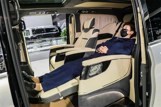 迈莎锐MV600二排配备的CEO级航空电动按摩椅带双节腿托,具有十六项调节功能;后排三联沙真皮沙发椅可一键平放成床,满足宾客更多的休憩需求。