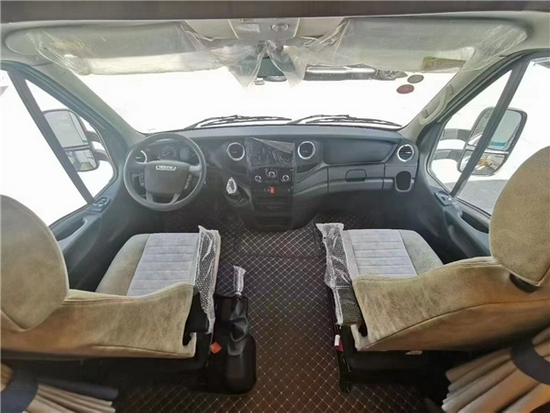 进入车内被这款房车金碧辉煌内饰的气势所震撼,在灯光的映射下,白色烤漆柜门以及晶莹剔透的玻璃门都在闪闪发亮,无处不彰显奢华。车内家具选用环保板材,地面铺设的是环保阻燃地板革。拓展舱打开后,内部空间极其宽敞,可以供一家人舒适生活,内顶安装了德国进口REMIS天窗。在车厢内部,第一眼可以看到的就是拓展式的卡座。对坐式沙发卡座采用2+2的布置形式,中间安装了一块可以升降的桌板,桌板降下来以后摇身一变成为一张长度1.9米,宽度0.9米的单人沙发床。