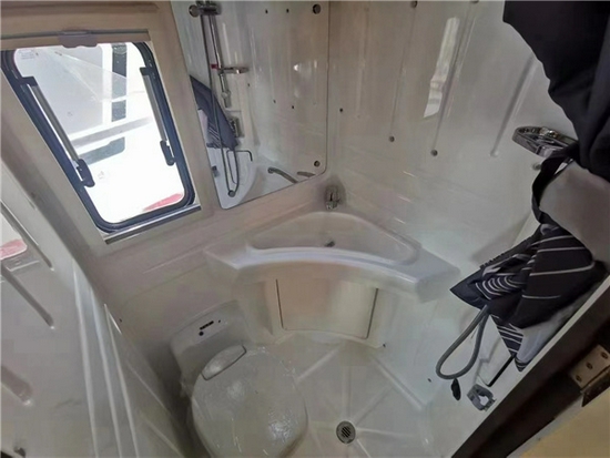 车厢右侧是车内的厨卫区域,厨房提供了微波炉、抽油烟机、电磁炉、洗菜池等设备,在厨房的上方还提供了一个小型酒柜,可以存放一些个人珍藏的美酒;底部则是一台大宇洗衣机。还有一台容积达到了152L的赛特福德房车专用冰箱,能够轻松满足一家人2-3天的食物储备。